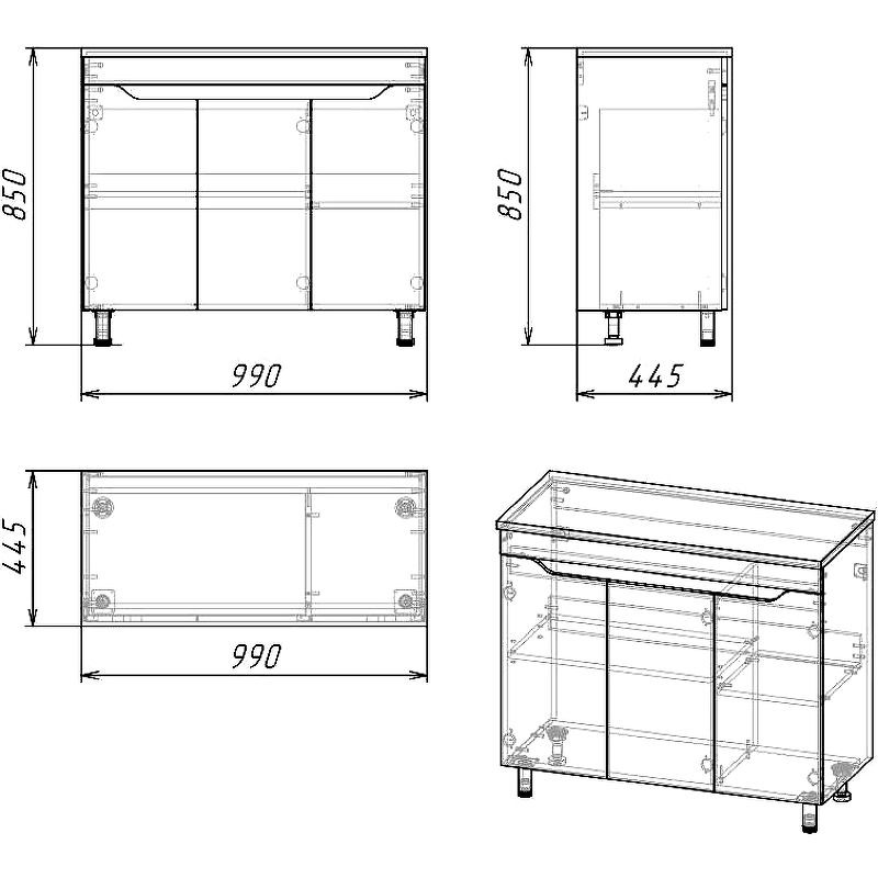 Фасады и боковины толщиной 16 мм. Комплектация: удобное открывание за фасад, петли с доводчиком, опоры регулируемые металл.