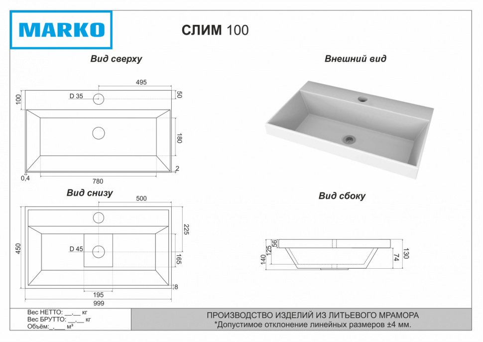 | Форма | Прямоугольная |