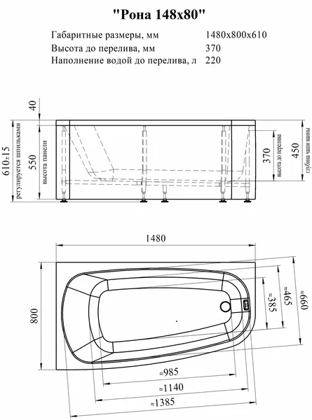 Ванна акриловая РОНА 148*80*61R,Radomir.