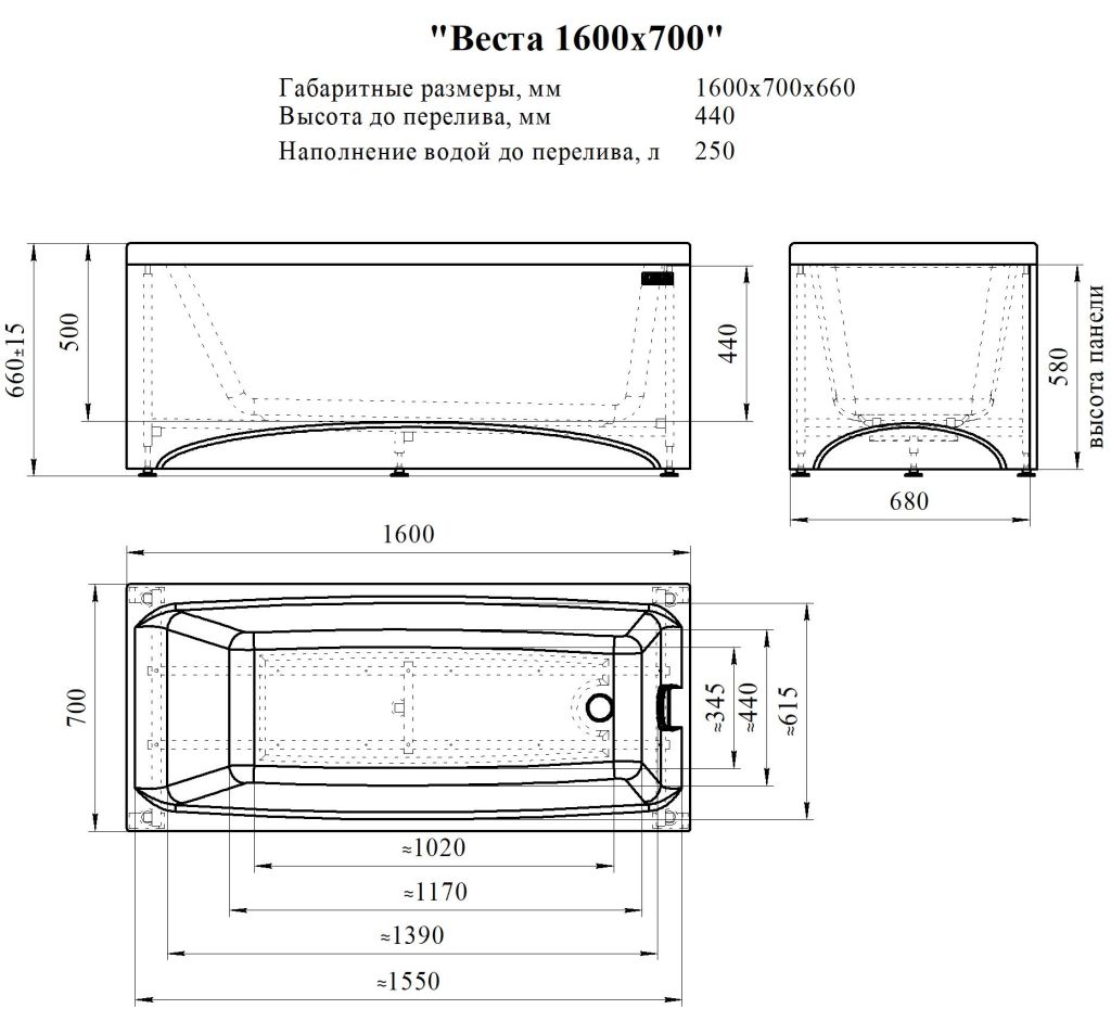 Ванна акриловая ВЕСТА 160*70*61, Radomir.
