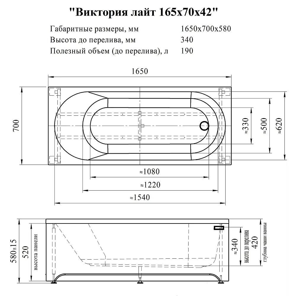 Ванна акриловая ВИКТОРИЯ ЛАЙТ 165х70*58, Radomir.