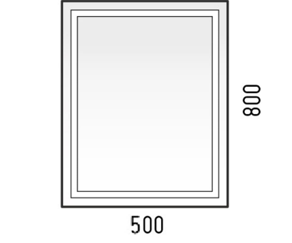 Размеры изделия составляют 500 мм в ширину и 800 мм в высоту. По периметру зеркала проходит полоса пескоструя шириной 25 мм, которая подсвечивается при нажатии кнопки.