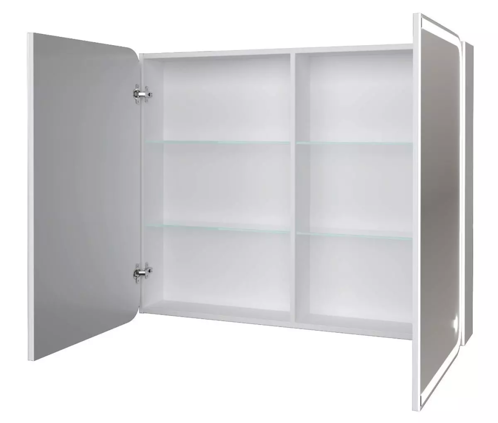 Шкаф с зеркалом Анда 90х80 c Led подсветкой сенсор - удобный и стильный атрибут для ванной комнаты, который изготовлен в лаконичном стиле, а потому прекрасно впишется в любой интерьер. Зеркало состоит из двух створок, за которыми скрыты отделения со стеклянными полками, куда можно сложить необходимые вещи и средства гигиены. Петли установлены с доводчиком. Выключатель сенсорный, располагается непосредственно на лицевой стороне зеркала.